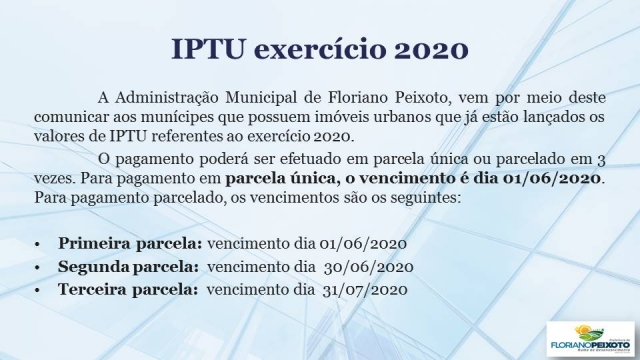A Administração Municipal de Floriano Peixoto, vem por meio deste comunicar aos munícipes que possuem imóveis urbanos que já estão lançados os valores de IPTU referentes ao exercício 2020.